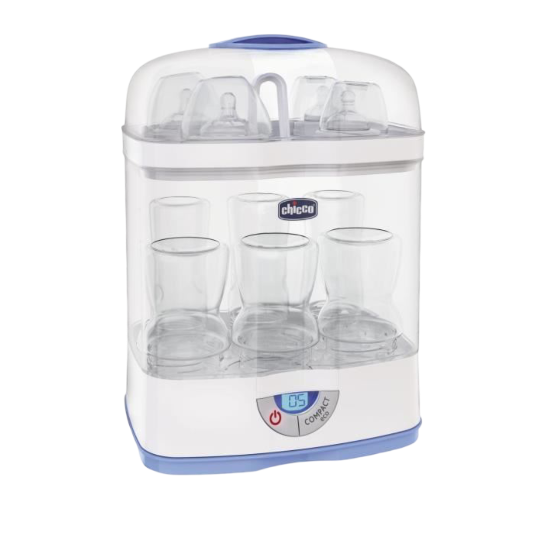 Ce stérilisateur électrique 3-en-1 de Chicco utilise la puissance de la vapeur pour éliminer jusqu’à 99,9 % des germes sur les biberons, tétines, accessoires et jouets. Il offre trois modes d’utilisation — grand format, compact et micro-ondes — pour s’adapter à tous les besoins.