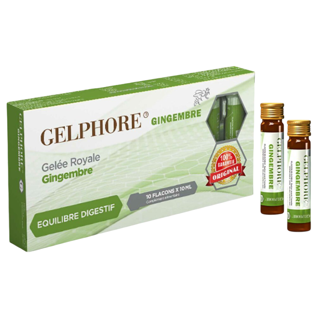 Gelphore Gingembre associe gelée royale (500 mg) et gingembre (150 mg) pour soutenir la digestion et soulager les nausées.