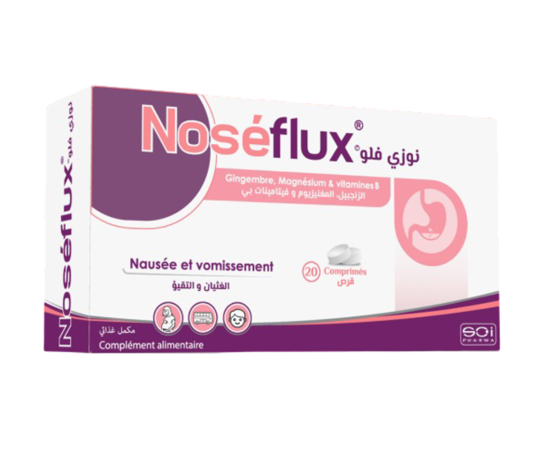 Noséflux combine des actifs naturels (gingembre, magnésium, vitamines B) réputés pour leur efficacité digestive, dans une formule douce.